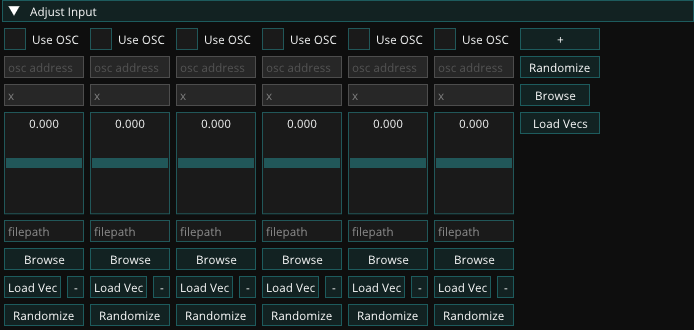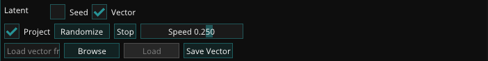 This widget allows you to move the latent vector in adjustable directions. By default, the sliders correspond to random directions, each controllable also through OSC. You can also use Browse (on the right) to load the vectors calculated from the GANSpace module so that all the sliders correspond to the extracted features. It is also possible to load individual vectors for each slider or to randomize directions altogether or individually.