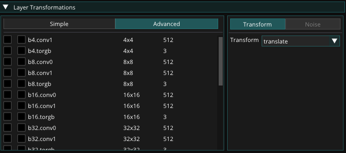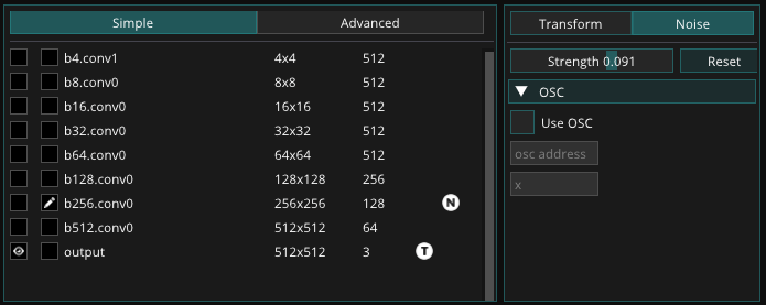 Per layer, you can either perform a transformation on the image or specify the strength of the noise. Which layers are actively manipulated is visible by the T and N icons. Some layers do not have any adjustable Noise, hence the noise tab is grayed out for those layers.