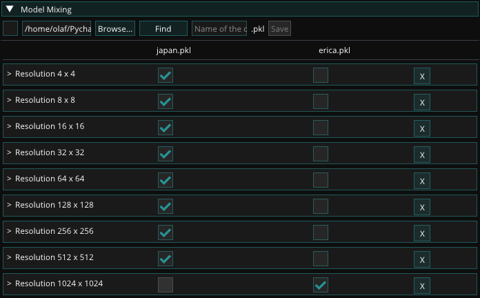 When mixing, you can choose to select features based on resolution or by layer. The latter option provides finer control, but the former option usually suffices. You can also remove features by pressing "X." This can be useful when one of the models generates images of higher resolution, and you want to align the resolution with the lower-resolution model.