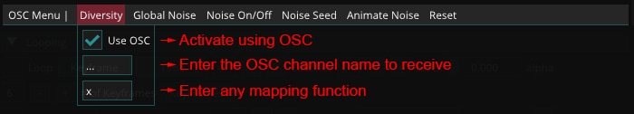 It displays the different parameters that can be controlled using OSC. By clicking on a parameter name, a popup opens which allows you to check the box Use OSC to activate the OSC control for that parameter. In the next field, you can provide the OSC channel name. The last field is a mapping function that can be used to perform post-processing on the control signal to make sure that the right data range is used. This follows the math format defined by Python.