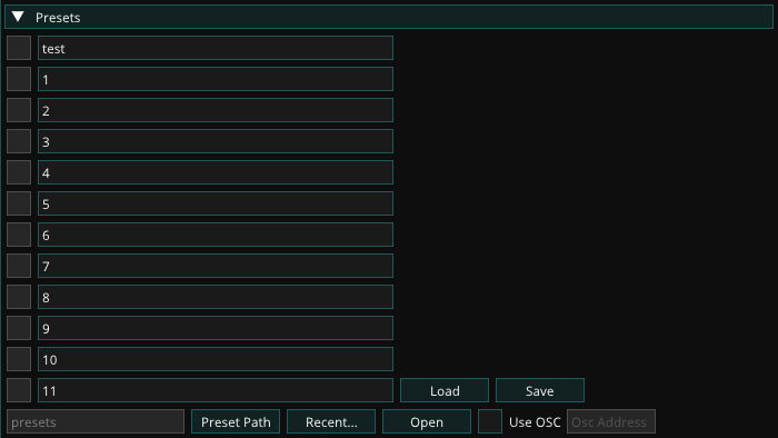 The OSC controls of this widget allow you to switch between presets in the current folder, by sending the name of the preset. Please note that you can rename your presets.