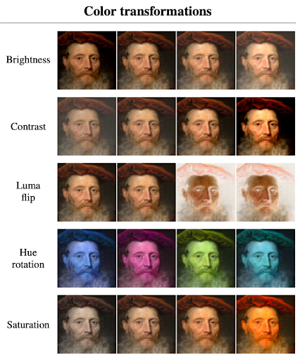 Colour transformations simulate different lighting through brightness, contrast, and saturation changes.