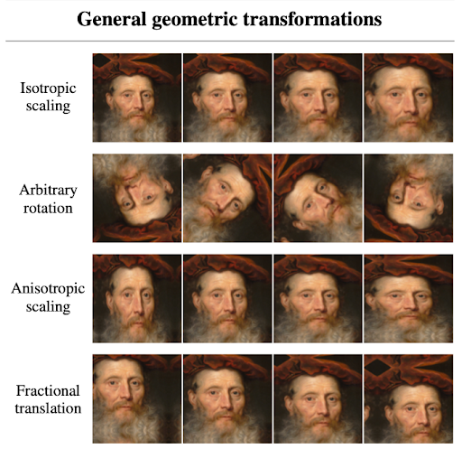 General geometric transformations include zoom, rotation (up to 360°), and stretching/squishing.
