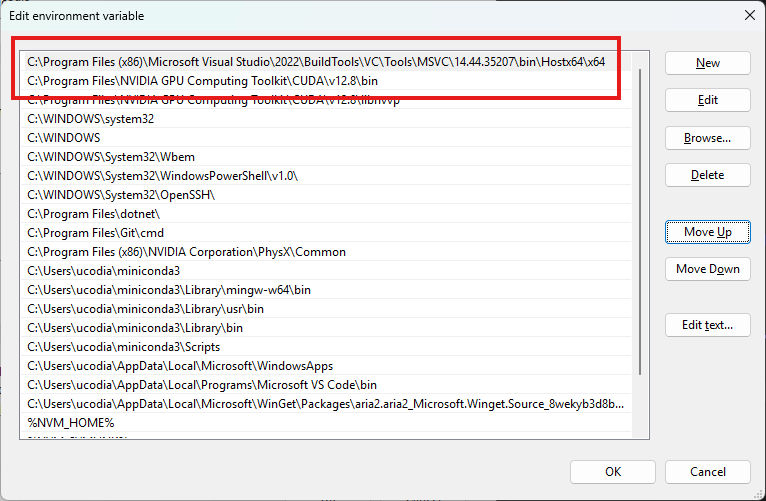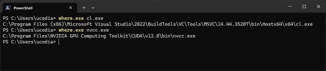 where.exe cl.exeand enter, thenwhere.exe nvcc.exeand enter. In both case it should retun the path as configured in the previous step.